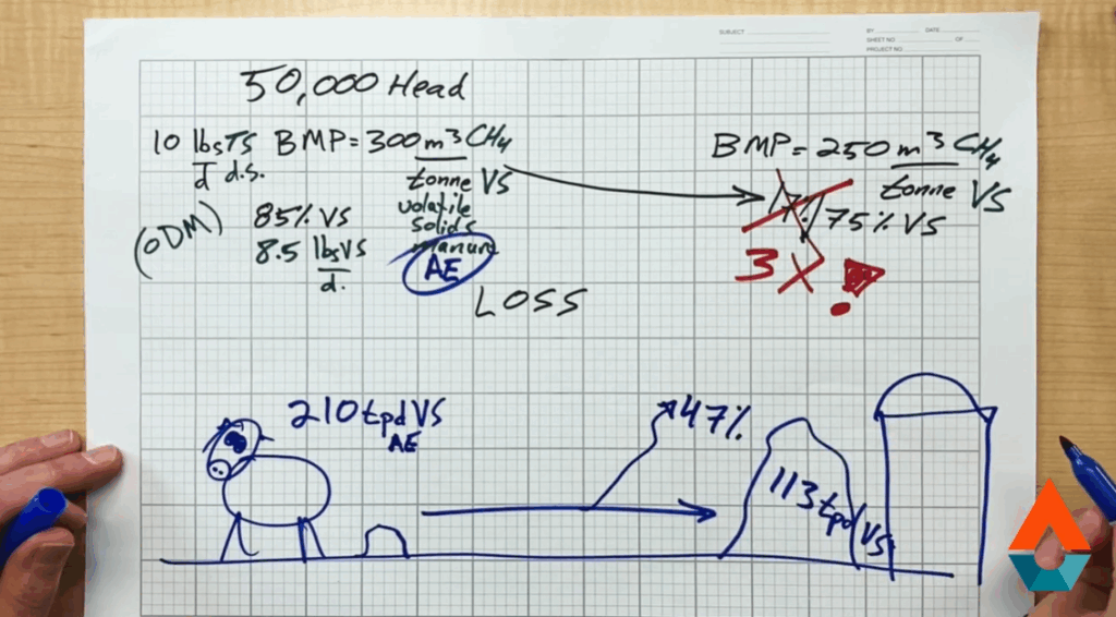 In real life though, by the time the manure gets to the digester (or is sampled) and the volatile solids has dropped from 85% to 75% VS, you can be down from 210 tons per day to 113 tons of volatile solids, which is a 47% loss.